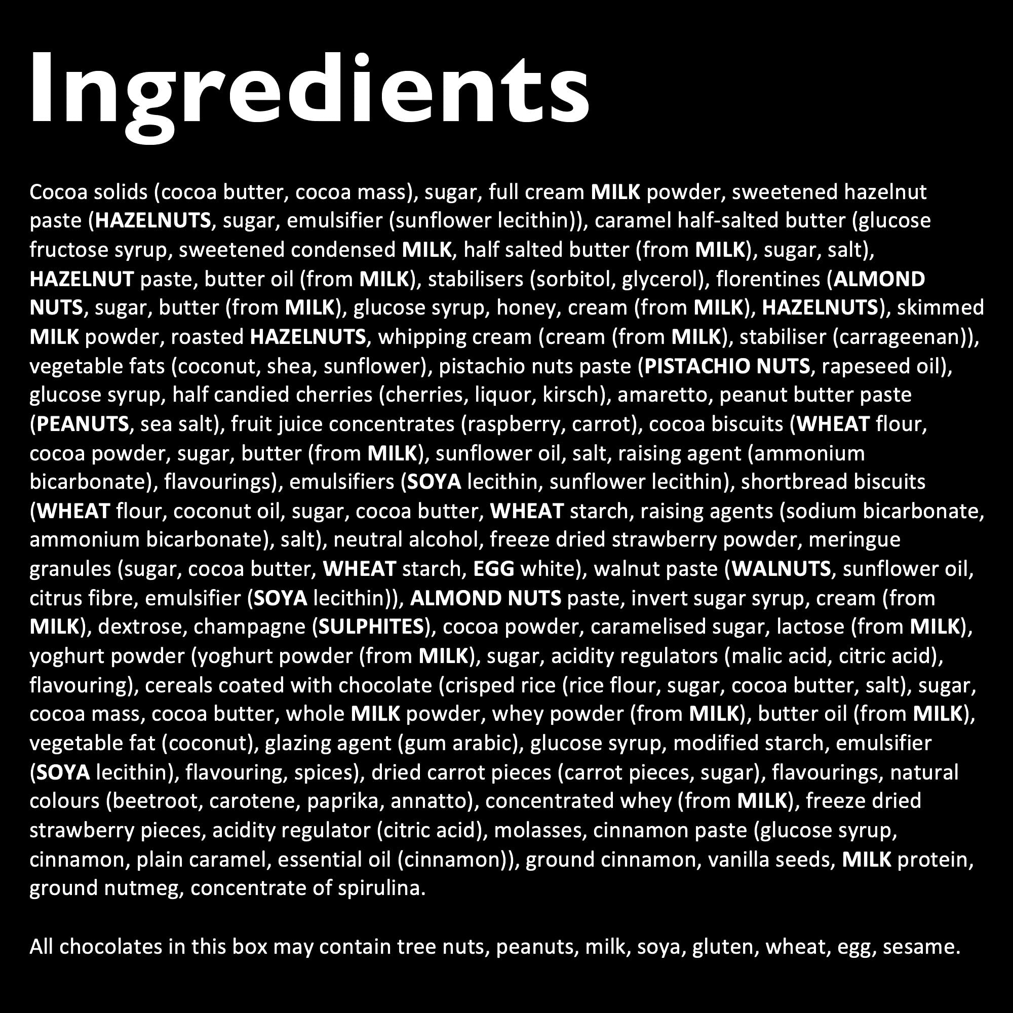Ingredients: cocoa solids (cocoa butter, cocoa mass), sugar, full cream MILK powder, sweetened hazelnut paste (HAZELNUTS, sugar, emulsifier (sunflower lecithin)), caramel half-salted butter (glucose fructose syrup, sweetened condensed MILK, half salted butter (from MILK), sugar, salt), HAZELNUT paste, butter oil (from MILK), stabilisers (sorbitol, glycerol), florentines (ALMOND NUTS, sugar, butter (from MILK), glucose syrup, honey, cream (from MILK), HAZELNUTS), skimmed MILK powder, roasted HAZELNUTS, whipping cream (cream (from MILK), stabiliser (carrageenan)), vegetable fats (coconut, shea, sunflower), pistachio nuts paste (PISTACHIO NUTS, rapeseed oil), glucose syrup, half candied cherries (cherries, liquor, kirsch), amaretto, peanut butter paste (PEANUTS, sea salt), fruit juice concentrates (raspberry, carrot), cocoa biscuits (WHEAT flour, cocoa powder, sugar, butter (from MILK), sunflower oil, salt, raising agent (ammonium bicarbonate), flavourings), emulsifiers (SOYA lecithin, sunflower lecithin), shortbread biscuits (WHEAT flour, coconut oil, sugar, cocoa butter, WHEAT starch, raising agents (sodium bicarbonate, ammonium bicarbonate), salt), neutral alcohol, freeze dried strawberry powder, meringue granules (sugar, cocoa butter, WHEAT starch, EGG white), walnut paste (WALNUTS, sunflower oil, citrus fibre, emulsifier (SOYA lecithin)), ALMOND NUTS paste, invert sugar syrup, cream (from MILK), dextrose, champagne (SULPHITES), cocoa powder, caramelised sugar, lactose (from MILK), yoghurt powder (yoghurt powder (from MILK), sugar, acidity regulators (malic acid, citric acid), flavouring), cereals coated with chocolate (crisped rice (rice flour, sugar, cocoa butter, salt), sugar, cocoa mass, cocoa butter, whole MILK powder, whey powder (from MILK), butter oil (from MILK), vegetable fat (coconut), glazing agent (gum arabic), glucose syrup, modified starch, emulsifier (SOYA lecithin), flavouring, spices), dried carrot pieces (carrot pieces, sugar), flavourings, natural colours (beetroot, carotene, paprika, annatto), concentrated whey (from MILK), freeze dried strawberry pieces, acidity regulator (citric acid), molasses, cinnamon paste (glucose syrup, cinnamon, plain caramel, essential oil (cinnamon)), ground cinnamon, vanilla seeds, MILK protein, ground nutmeg, concentrate of spirulina.